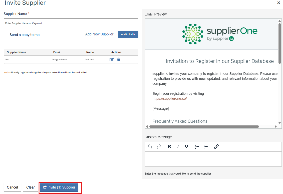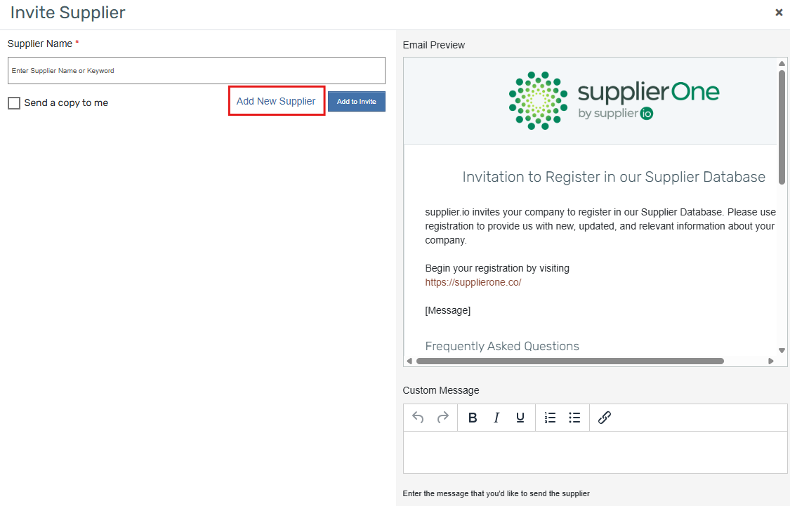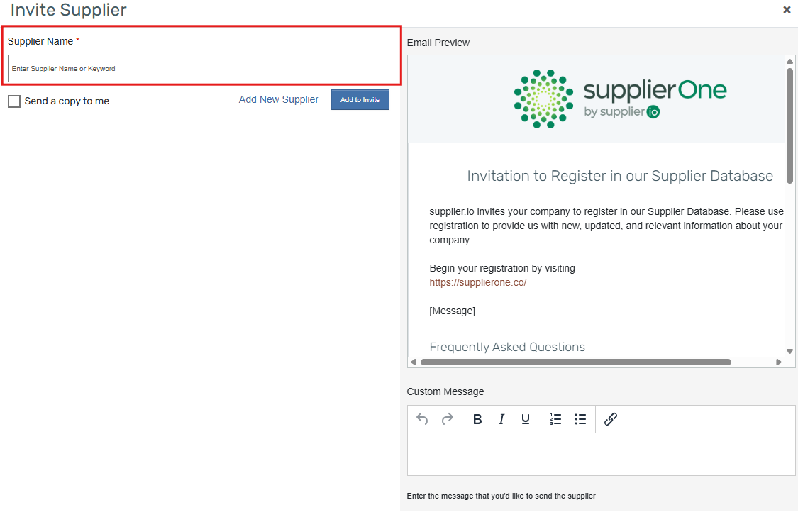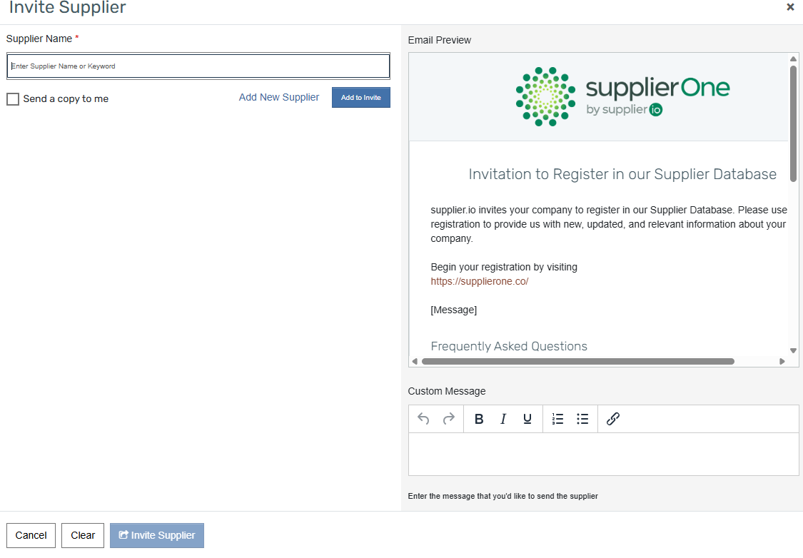 - Select "Invite Suppliers" from the drop-down menu. Once you have done so, a pop-up window, shown below, will appear.